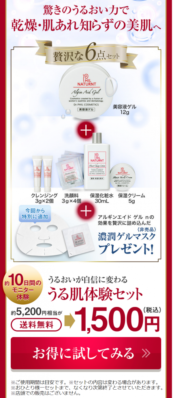 といった豪華なアイテムばかりがラインナップされています。アルギンエイドゲルだけではなく、トラベル用にも便利なトライアルキットがセットなって1500円なので、とってもリーズナブルに購入OK♡さらに、今回から特別に追加されたアルギンエイドゲルの効果を凝縮した、非売品レアな濃縮ゲルマスクも無料でプレゼントされます◎