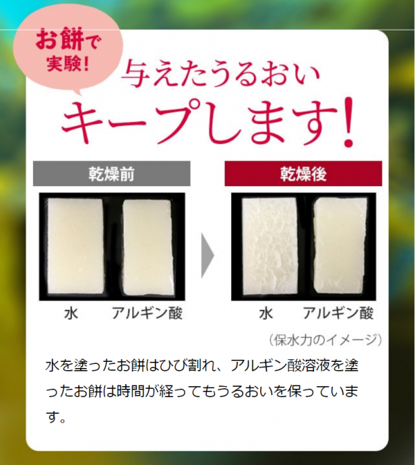 皮膚科学研究に基づいてブレンドされたアルギン酸は、この溶液をカサカサのお餅に塗って、実験をした写真がオフィシャルサイトにてUPされていました↓↓