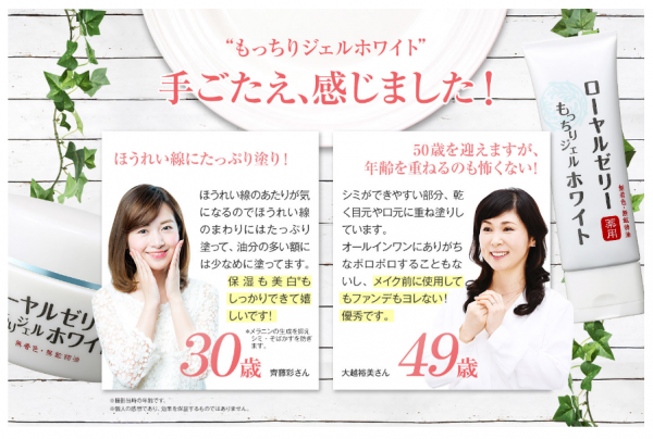 美白系の化粧品を使うと、肌がヒリヒリしたり赤くなったりとトラブルを起こすことが多いのですが、ローヤルゼリーもっちりジェルホワイトは、それが全くありませんでした。やっとこれから長く続けられる美白化粧品見つかって良かったです。